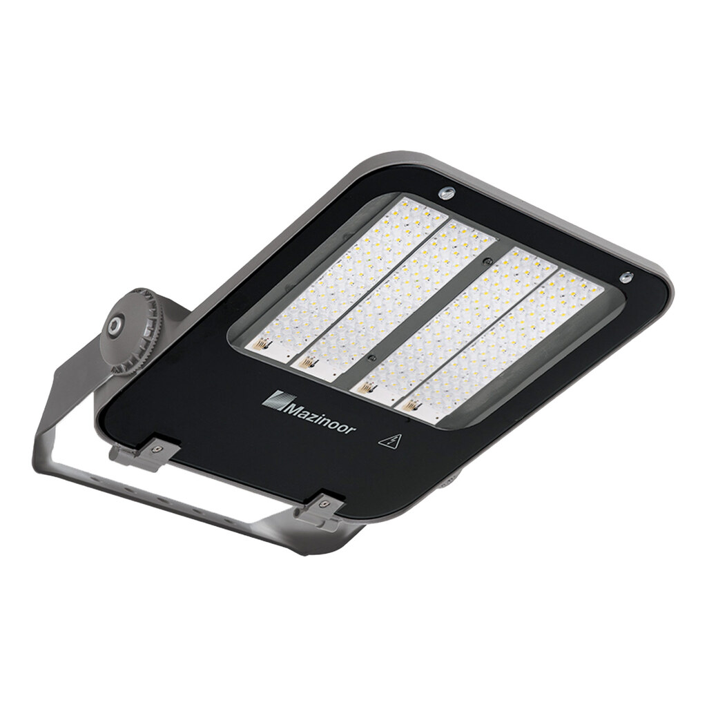 بررسی پروژکتور ۲۰۰ وات مازی نور مدل اپتیلوکس پخش نامتقارن نور | برای نورپردازی فضاهای رو باز و حیاطی، یکی از کاربردیترین تجهیزات، پروژکتورها، نورافکنها و همچنین چراغهای خیابانی هستند. این دسته از وسایل نورپردازی که با تکنولوژیهای مختلف ال ای دی، اس ام دی، سی او بی، گازی و… تولید میشوند، در برابر رطوبت و گردوغبار مقاوم بوده و میتوانند نور فضاهای بزرگ را به خوبی فراهم کنند. شما میتوانید علاوه بر فضاهای باز، برای نورپردازی کارخانهها و کارگاهها، سولهها و انبارها، ورزشگاهها و سالنها ورزشی و… نیز از این تجهیزات نورپردازی استفاده کنید. | یکی از برندهای خوشنام و درجه یک در تولید محصولات روشنایی و برقی، مازینور نام دارد که مجموعهای باکیفیت در تولید چراغهای اداری و تجاری، چراغهای بزرگ صنعتی، پنلها و … است. این شرکت با داشتن گواهینامه TÜV آلمان، توانسته است چراغهای خود را تحت لیسانس شرکت آلمانی آدولف شوخ تولید کند. این مجموعه با بیش از ۴۰ سال تجربه و به کار گرفتن فناوریهایی نوین در زمینه تولید چراغ، همواره در جهت جلب رضایت مشتریان خود میکوشد تا بهترینها را به آنها ارائه دهد. | پروژکتور ۲۰۰ وات مازی نور مدل اپتیلوکس پخش نامتقارن نور از جمله محصولاتیست که مجموعه مازی نور با استفاده از دستگاههای پیشرفته و تکنولوژی روز دنیا تولید کرده است. این محصول با طراحی مدرن و بدنه بسیار مقاوم، مناسب فضاهای باز و بسته است. بدنه این پروژکتور از آلومینیوم دایکاست تولید شده که باعث وزن مناسب، استحکام بالا و همچنین درجه حفاظت عالی IP66 میشود. شما میتوانید از چراغ پروژکتوری مدل اپتیلوکس برای نورپردازی انواع فضاهای خارجی استفاده میشود که علاوه بر نورپردازی اصولی و مناسب، جلوه زیبایی به محیط میدهد.